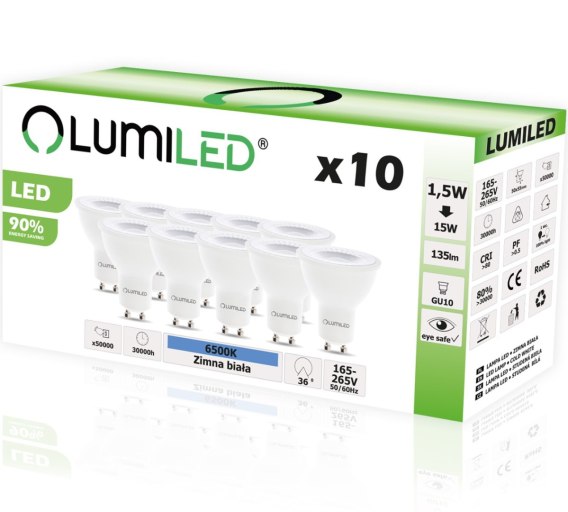 10x Żarówka LED GU10 1,5W = 15W 135lm LUMILED Zimna 6500K 36°