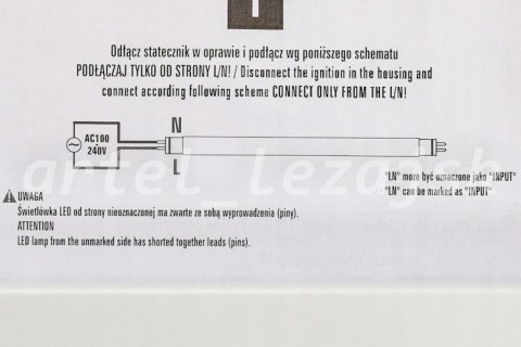 - W przypadku posiadania oprawy pod ledy: Świetlówkę LED wkładamy tą stroną na której pisze "L N" w oprawkę do której są doprowadzone przewody, następnie obracamy o 90°
