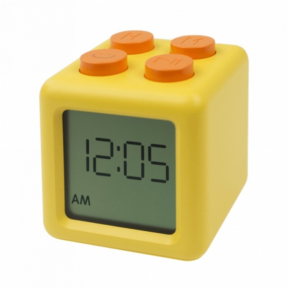 Budzik w formie klocka w intensywnie żółtym kolorze, wyposażony w cyfrowy wyświetlacz LED. Zasilany jedną baterią CR2032 (3 V DC), co sprawia, że jest niezależny od przewodów i bardzo łatwy w użyciu. Idealny jako dekoracja pokoju dziecięcego, do biura lub na stolik nocny.