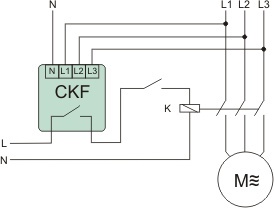 - Czujnik nie pozwala na uruchomienie silnika w przypadku nieprawidłowej kolejności faz przed czujnikiem, co chroni silnik przed niepożądaną zmianą kierunku wirowania.