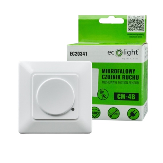 Mikrofalowy czujnik ruchu CM-4B - biały to nowoczesne rozwiązanie do automatycznego sterowania oświetleniem w domu, biurze lub innym pomieszczeniu użytkowym. Wykorzystuje technologię mikrofalową, która zapewnia wysoką czułość i szybką reakcję na ruch — nawet przy minimalnej aktywności w strefie detekcji.