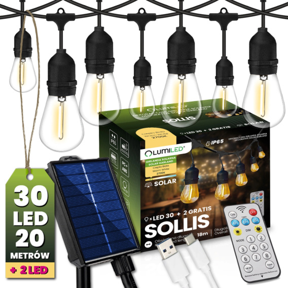 ✨ Girlanda solarna SOLLIS marki Lumiled to połączenie nowoczesnego designu, energooszczędnej technologii i niezrównanej funkcjonalności. Emitując ciepłe światło (2700K), tworzy przytulną atmosferę idealną do ogrodu, na taras czy balkon.