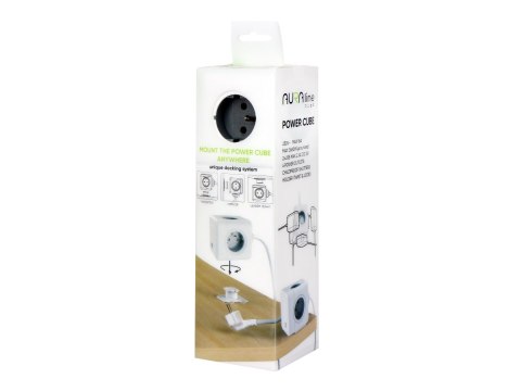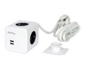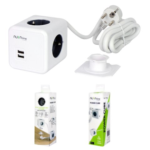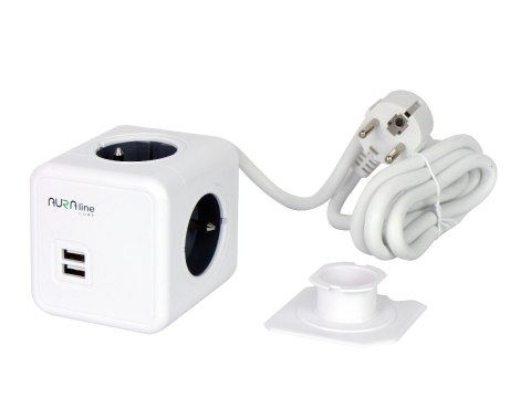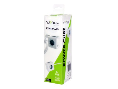 • Przedłużacz 4 gniazda + 2 USB 2,1A/5V AURA line CUBE przewód 1,5m 16A Uchwyt montażowy