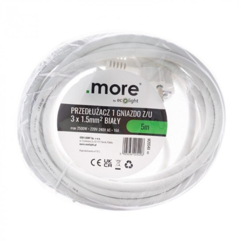• Przedłużacz 5m sieciowy z uziemieniem 3x1,5mm 1 Gniazdo 16A Biały Domowy