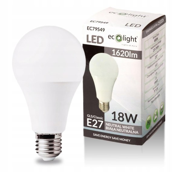 ⚡️Kupuj żarówkę LED CLASSIC E27 18W NEUTRALNA 4000K 1620lm, idealną do Twojego domu lub biura. Ta żarówka o mocy 18W jest wyjątkowo energooszczędna, dzięki czemu zmniejsza zarówno Twój rachunek za prąd, jak i wpływ na środowisko. Zasilana napięciem 220-240V AC, jest idealna do wielu standardowych opraw żarówkowych.