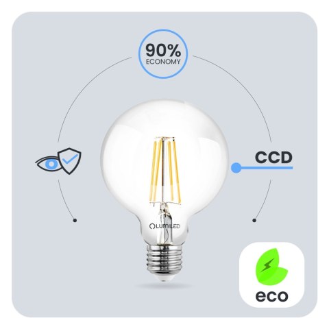 Żarówka LED G125 wyróżnia się strumieniem świetlnym 806 lumenów, co odpowiada tradycyjnej żarówce o mocy 60W, przy zużyciu zaledwie 7W. Dzięki nowoczesnej przetwornicy CCD, światło jest stabilne i nie migocze, co chroni wzrok i zapewnia komfort użytkowania. Jej trwałość wynosi aż 15 000 godzin, co czyni ją ekonomicznym i trwałym rozwiązaniem oświetleniowym.