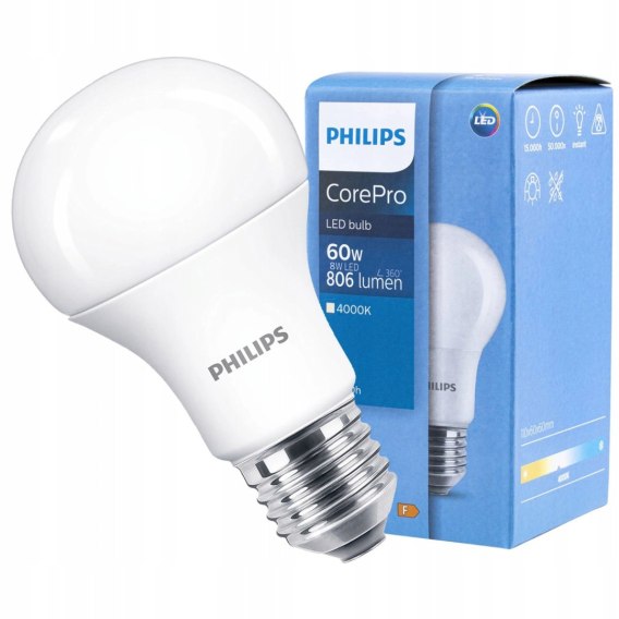 ⚡️ Żarówka LED E27 A60 8W = 60W 806lm 4000K Neutralna PHILIPS to nowoczesne i ekonomiczne rozwiązanie, idealne dla osób dbających o domowy budżet. Dzięki nowoczesnej technologii LED produkt zapewnia wysoką skuteczność świetlną oraz znaczące oszczędności energii. Zastosowanie mlecznego klosza gwarantuje równomierne i przyjazne dla oczu oświetlenie, idealne do każdego wnętrza.