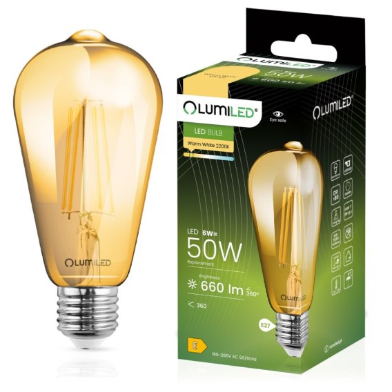 Żarówka LED E27 ST64 6W = 50W 660lm 2000K Ciepła 360° Filament