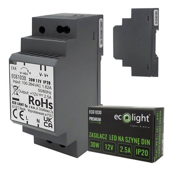 Zasilacz na Szynę DIN 12V DC 30W Premium to niezawodne rozwiązanie przeznaczone do montażu na szynie DIN, idealne dla różnych systemów zasilania niskonapięciowego, takich jak oświetlenie LED, systemy alarmowe oraz automatyka przemysłowa. Dzięki niewielkim wymiarom 90.5 x 34 x 58.5 mm, zasilacz jest łatwy w montażu i oszczędza miejsce w rozdzielnicach elektrycznych.