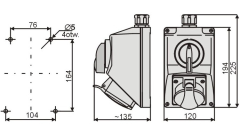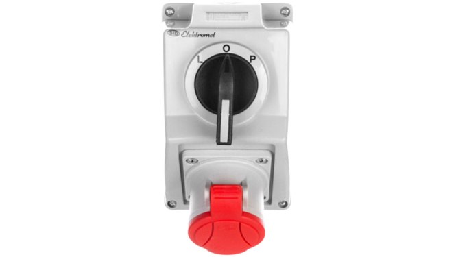 Zestaw instalacyjny budowlany składający się z gniazda siłowego 3P+N+Z 16A i łącznika krzywkowego typu lewy-prawy (do zmiany kierunku obrotów silnika). Przełącznik zawiera blokadę z otworami ⌀8mm na kłódkę zabezpieczającą przed nieuprawnionym włączeniem urządzenia. Montowany na stałe natynkowo z wysoką odpornością na uszkodzenia mechaniczne i podwyższoną klasą szczelności IP54 (pyłoszczelność i bryzgoszczelność). Wykonanie gwarantuje długą żywotność wyrobu, a konstrukcja łatwość instalacji. Idealna w warsztatach, zakładach i garażach.