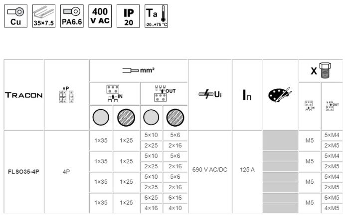 4×35(25)mm2 / 3×5×10,3×2×25 / 4×16,6×25mm2, 690VAC/DC,125A